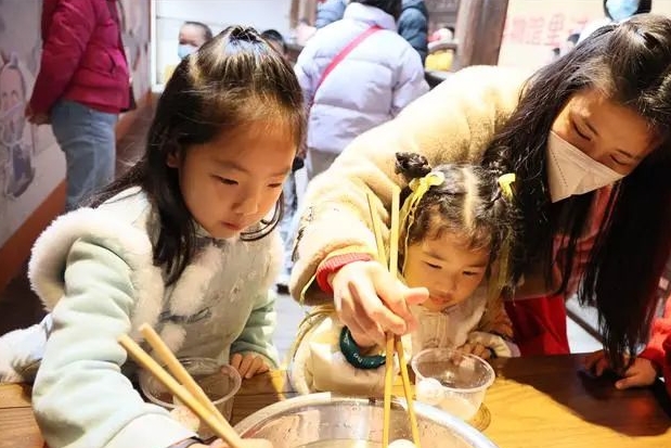 元宵游园会现场吸引众多市民齐聚雅集,多组家庭在工作人员的指引下带着游园攻略,进入“闯关”模式,踢毽子、品元宵、投壶、猜灯谜……沉浸式体验趣味游戏,感受传统民俗文化魅力。