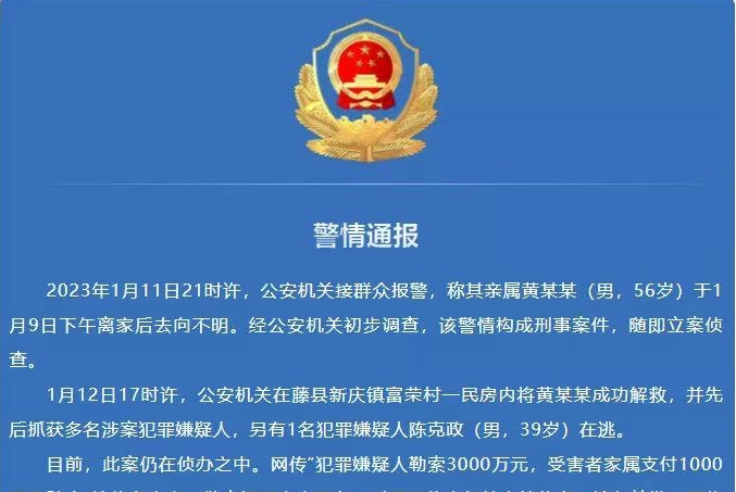 1月12日17时许,公安机关在藤县新庆镇富荣村一民房内将黄某某成功解救,并先后抓获多名涉案犯罪嫌疑人,另有1名犯罪嫌疑人陈克政(男,39岁)在逃。