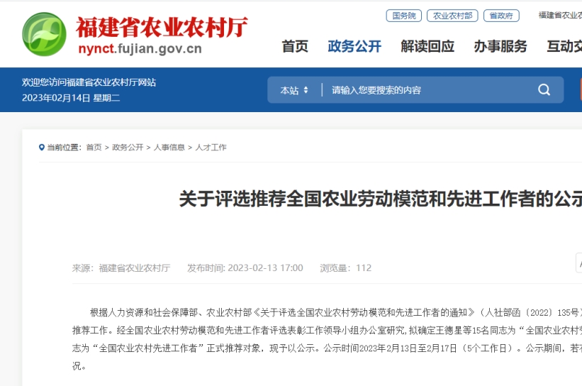 根据人力资源和社会保障部、农业农村部《关于评选全国农业农村劳动模范和先进工作者的通知》(人社部函〔2022〕135号)精神,全省组织开展了评选推荐工作。经全国农业农村劳动模范和先进工作者评选表彰工作领导小组办公室研究,拟确定王德星等15名同志为“全国农业农村劳动模范”、林德福等10名同志为“全国农业农村先进工作者”正式推荐对象,现予以公示。公示时间2023年2月13日至2月17日(5个工作日)。公示期间,若有异议,请电话或书面反映情况。