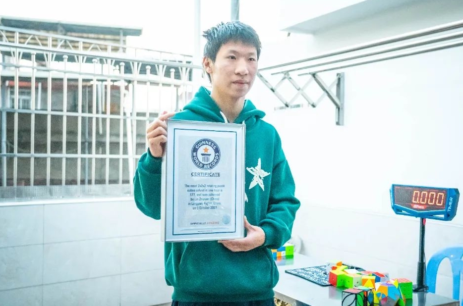 日前,新罗区一名18岁的高二学生林致远收到了一份特殊的开学礼物——一张吉尼斯世界纪录认证证书。他以1小时内复原577个二阶魔方的成绩创造了“1小时内复原最多二阶魔方”吉尼斯世界纪录。