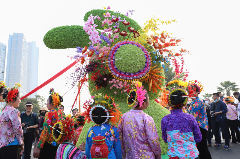 在东海街道丰海路一侧,鞭炮齐鸣,锣鼓喧天,蟳埔男子簇拥着妈祖神像的轿子,高擎万民伞和功德幡,各色彩旗迎风招展,蟳埔女子则头盘簪花围、身着各色大裾衫、阔脚裤,肩挑灯笼、花篮、五果等,打着鼓、敲着锣,盛装打扮的他们,满怀虔诚之心,祈求妈祖庇护“讨海”平安顺利,整个巡乡队伍犹如一片花的海洋。