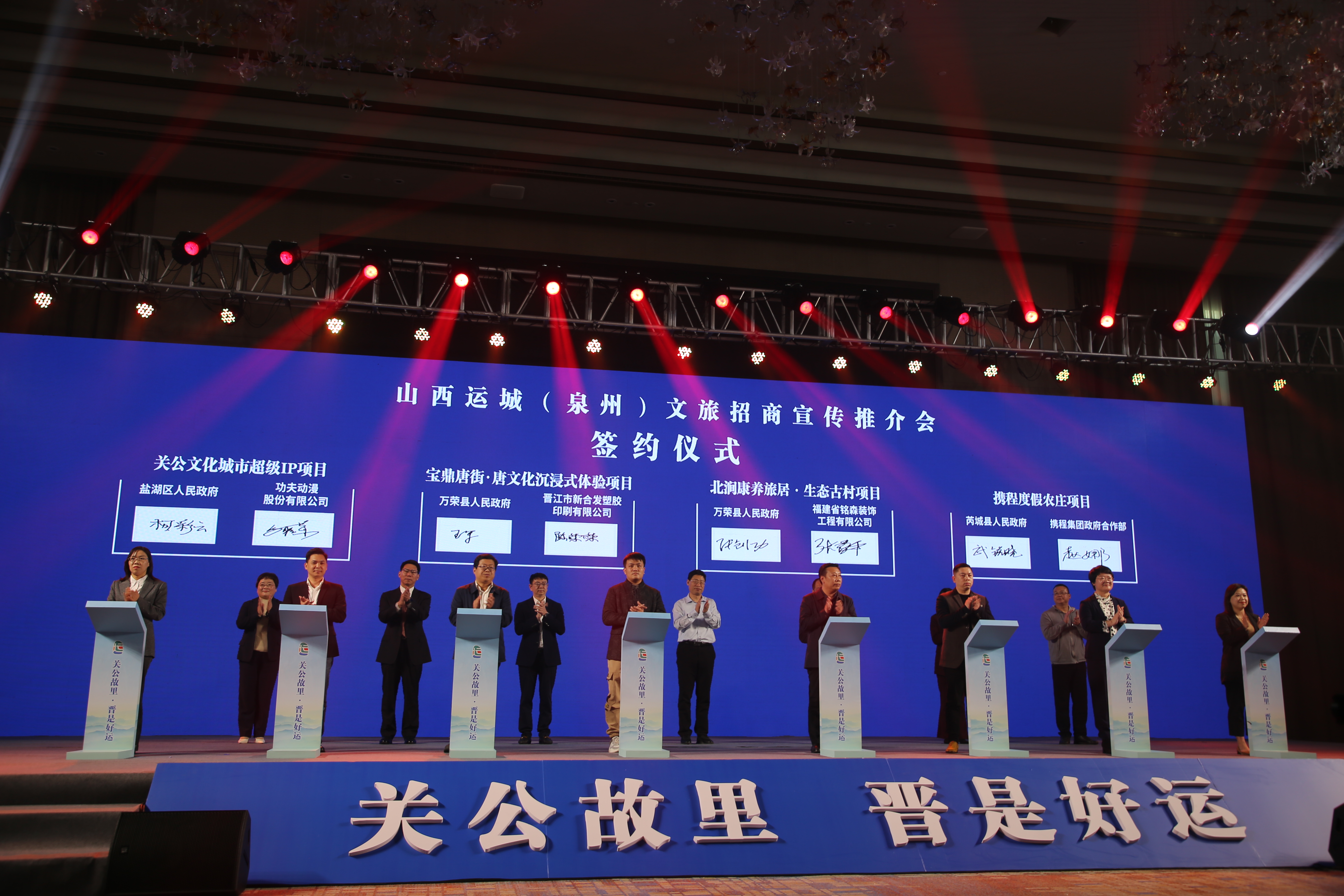 盐湖区政府和功夫动漫公司合作,打造关公文化城市超级IP;万荣县政府和晋江新合发塑胶公司合作,建设宝鼎唐杰唐文化沉浸式体验项目;万荣县政府和福建铭森装饰公司合作,建设北涧康养旅居生态古村项目;芮城县政府和携程集团合作,打造携程度假农庄项目……此次活动,运城、泉州两地一批重点文旅产业项目进行了签约,包含文旅产业类项目、“引客入运”游客输送合作项目等,签约额共计28.5亿。此外,运城还向泉州推出文旅大礼包,推出十条精品旅游线路、100万元免费旅游年票、交通出行政策等,还推出一项给以泉州人民的专属利好——乘坐深航航班前往运城观光旅游的泉州游客,凭登机牌一年内可以免费不限次数游览运城所有A级景区。