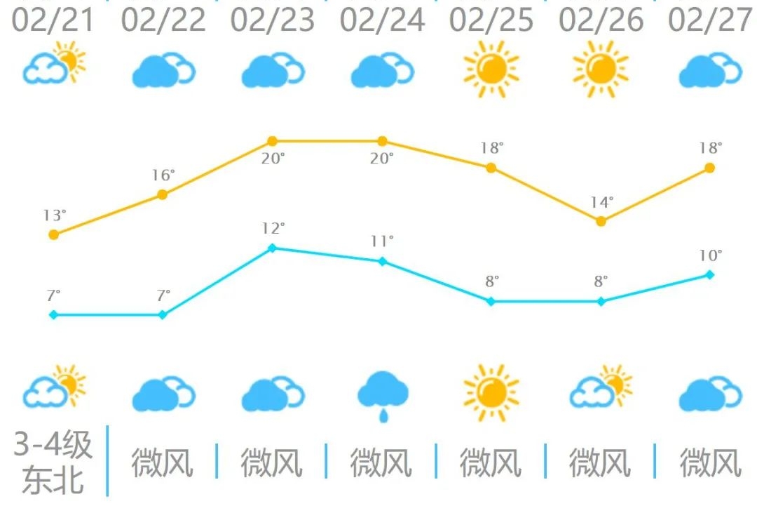 天气方面:今起三天(2月21日至23日),福州天气以多云到阴天气为主,24日云量多,部分县市有小雨。总体来说近期降水较少,空气将持续干燥,需及时补水润燥,居家需注意用火安全。