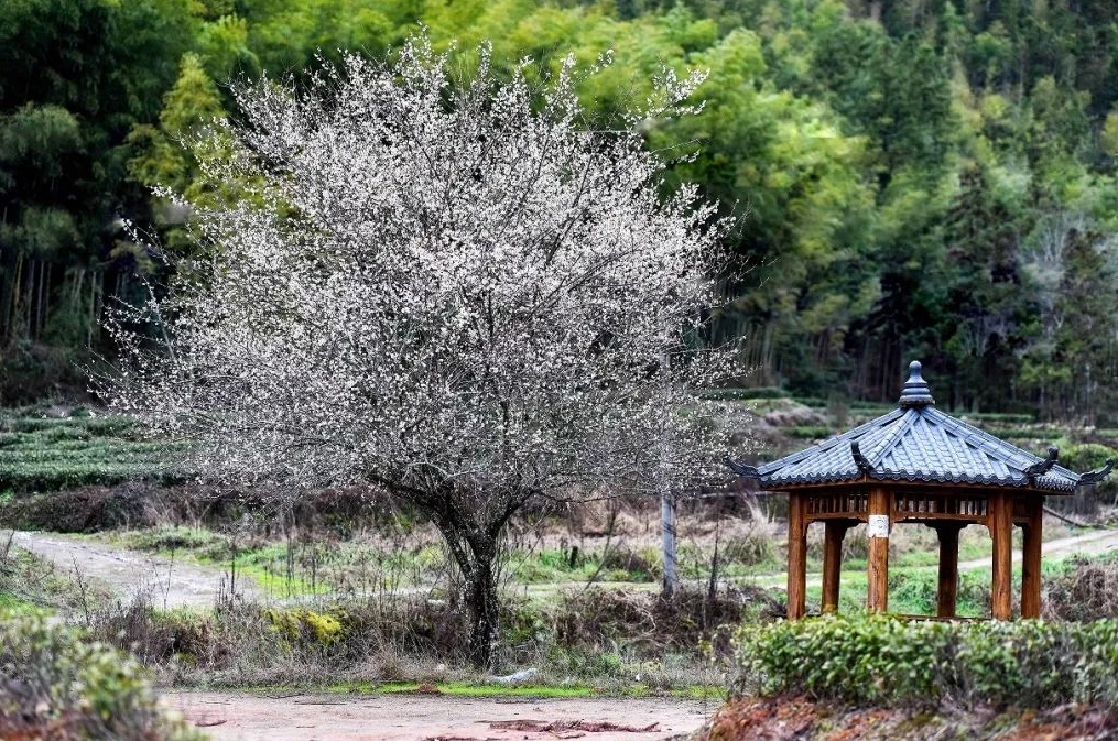 青梅花开似雪,随性自然。福建省南平市建阳区黄坑镇三峡村远离城市喧嚣,梅花在老树下、小亭边、田野里显得格外有韵味。