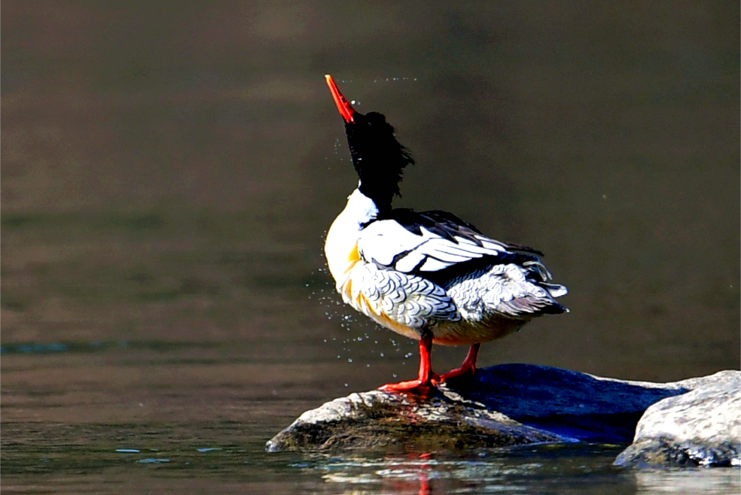 ▲一只雄性中华秋沙鸭正在抖去身上的水珠。