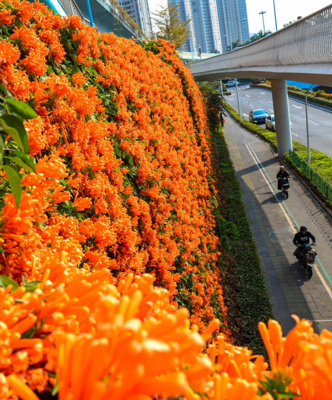 昨日下午,导报记者来到金山BRT站高架桥看到,成片的炮仗花沿着墙面倾泻而下,形成一条炮仗花带。在阳光的照射下,形似鞭炮的花朵泛着金光,鲜艳夺目,一阵风吹过,随风摇曳,婀娜多姿,组成一片暖意洋洋的花海。