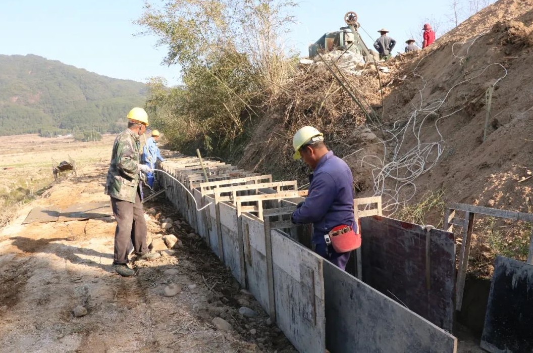 清淤挖沟、固板建模、灌浆建渠……2月21日,在浦城县永兴灌片施工现场,机声隆隆,工人们正在如火如荼进行水渠修建,以便全面提高永兴农田水利工程抗洪排涝能力,实现排水渠系畅通、耕地稳产增收,夯实乡村振兴基础。