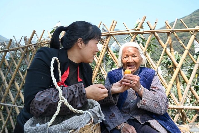 3月3日,吴素华(左)请村里的老人品尝刚摘下的新鲜枇杷。