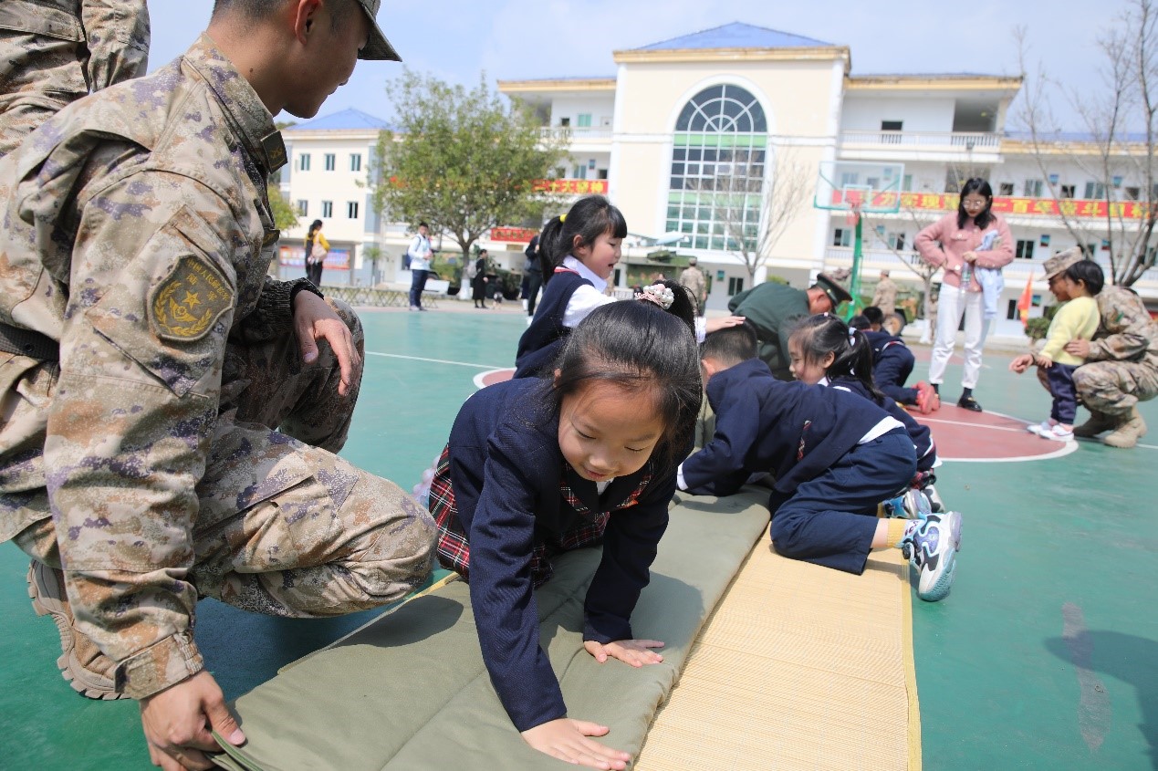 此外,官兵们精心准备的武器装备展示,更是为同学们带来了一场前所未有的视觉盛宴,让同学们的热情更加高涨。在聆听官兵对武器相关知识讲解后,同学们纷纷“零距离”触摸真刀真枪。学生们小小的双手举起有六七斤重的步枪,眼睛对准瞄准镜,上膛,扣动扳机……在官兵的指导下,同学们也展示得有模有样。