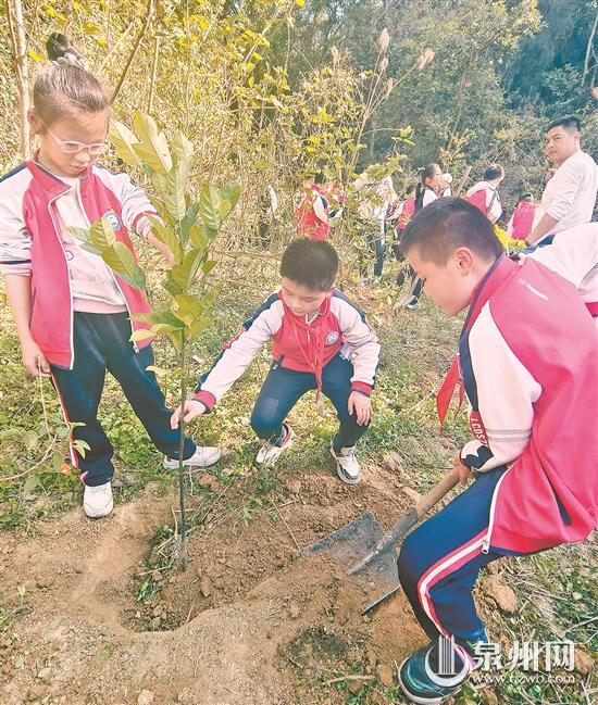 3月11日下午,福建省泉州市鲤城区第三中心小学联合鲤城区第五实验小学及金龙街道赤土社区开展“播撒新绿 溢满春天”植树节主题活动,40多名小学生在老师们的带领下,和社区工作人员来到赤土社区一座山上,种植了30棵果树苗。