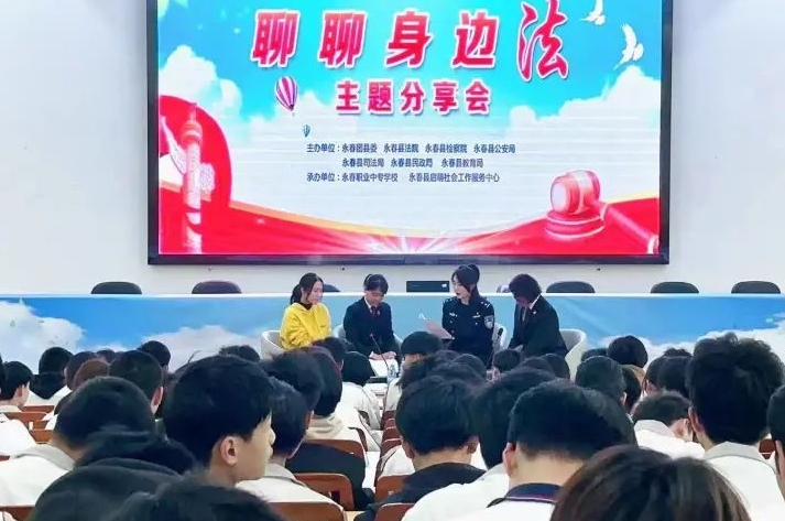 为提高青少年的法律意识和自我保护意识,引导广大学生学法、知法、懂法、守法,保障青少年的健康成长。近日,永春团县委、县法院、县检察院、县公安局、县司法局、县民政局、县教育局、永春县启萌社会工作服务中心走进永春职业中专学校共同开展“聊聊身边法”主题分享会,将法治的种子播撒在青春洋溢的校园里。