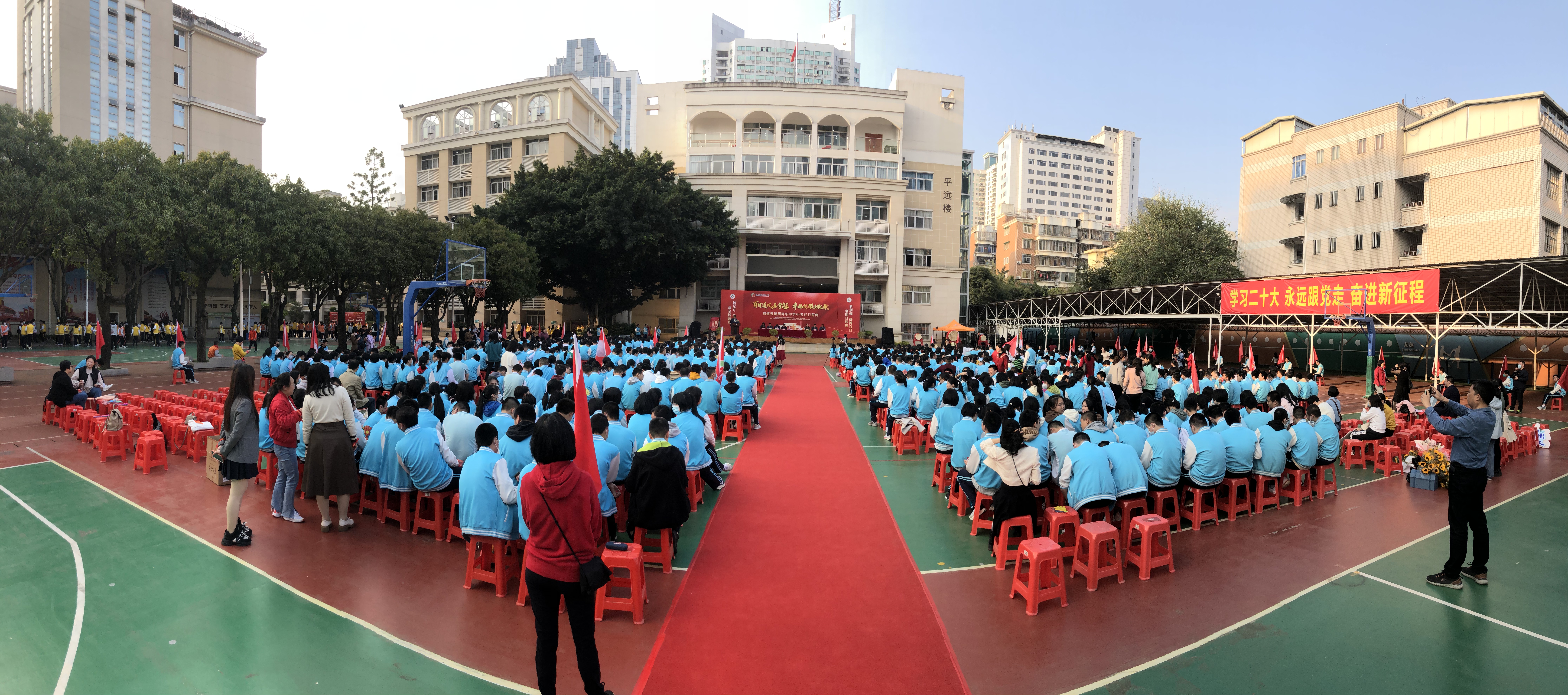 九年磨剑,六月试锋,2023年中考冲刺的号角已经吹响,冲刺的时刻已经到来。3月16日下午,福州屏东中学2023届初三中考百日冲刺誓师大会现场红旗招展,人声鼎沸。初三全体师生和学生家长代表齐聚会场,手持向日葵与标语横幅,为即将奔赴中考考场的学生加油鼓劲,呐喊助威,希望同学们能够圆梦六月,“一举夺魁”!
