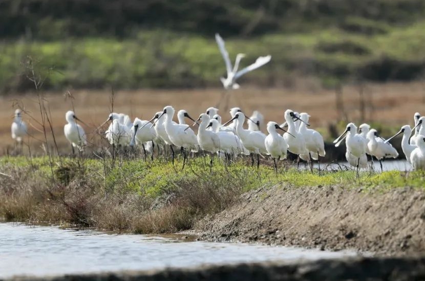 适宜的栖息地条件在迁徙季和越冬季吸引了大量滨海鸟类,山腰盐场单次记录鸟类数量超过7000只。这里也是许多珍稀鸟类的栖息地,包括黄嘴白鹭、白琵鹭、黑脸琵鹭、大杓鹬、大滨鹬、小青脚鹬、黑嘴鸥等国家级重点保鸟类。其中,黑脸琵鹭数量在2023年2月达到52只,超过了全球总数量的1%。