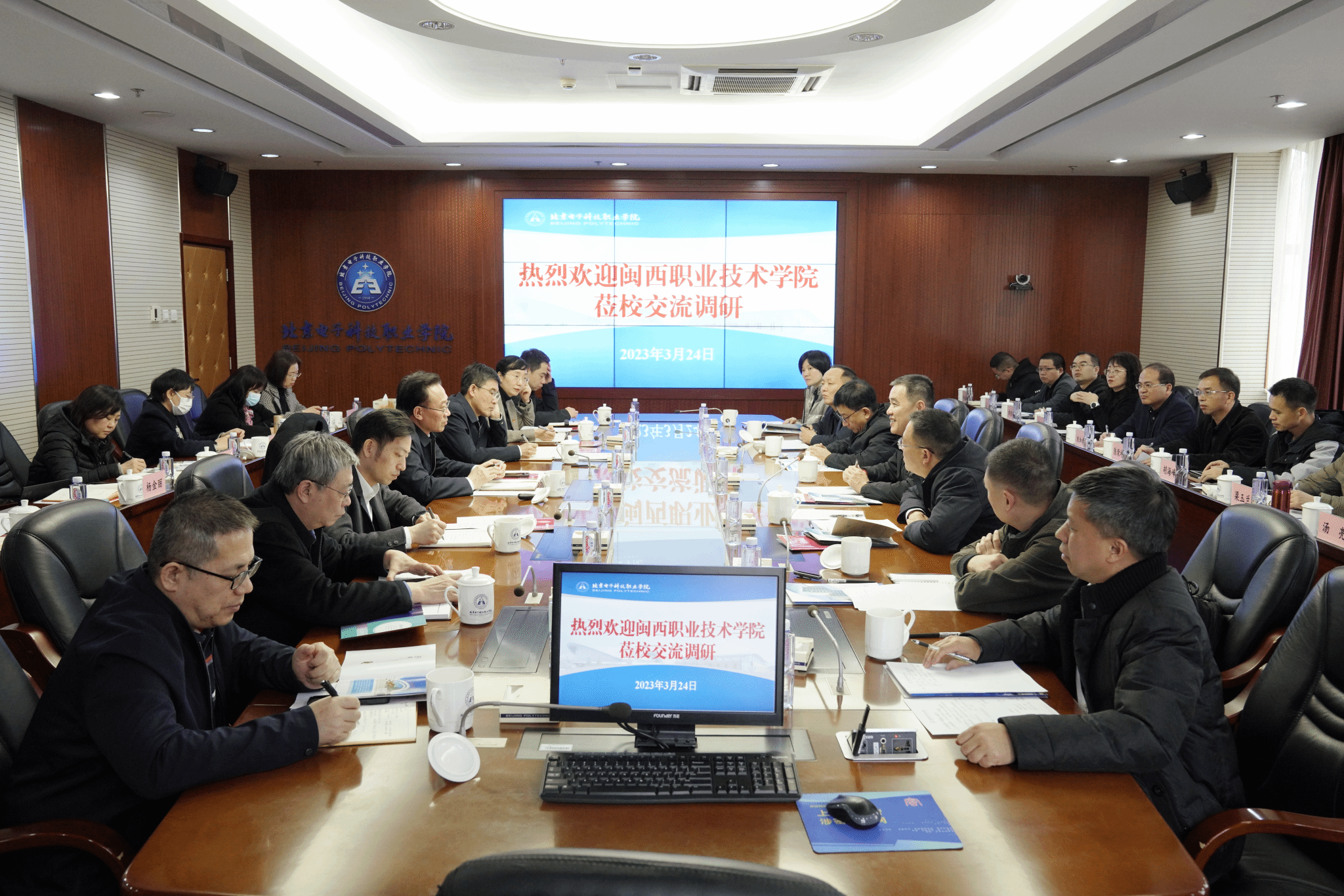 在北京电子科技职业学院,一行人参观了机电工程学院、汽车工程学院、电信工程学院、生物工程学院、艺术设计学院,详细了解了智能制造基地生产车间、集成电路中试基地、化药制剂与蛋白药物研发中试基地等各类专业化产教融合实训基地和应用技术协同创新中心的建设及运行情况,北京电子科技职业学院校长姚光业、副校长朱运利及各相关职能部门负责人随同参观并做了介绍。在座谈会上,北京电子科技职业学院校长姚光业对学习交流团一行的到来表示热烈欢迎,介绍了该校办学成效和办学特色,他希望两校今后进一步加强沟通交流,相互学习,相互借鉴;校党委书记卢伟耀对北京电子科技职业学院的热情接待表示感谢,他指出,近年来北京电子科技职业学院各项事业得到快速发展,各项成果令人印象深刻,成为开发区里办高职的典型样板及国家“双高校”建设的标杆,值得认真学习和借鉴,也真诚欢迎北京电子科技职业学院同仁来龙岩传经送宝,同时也接受革命老区的思想洗礼,携手实现高质量发展;校长梁俊平表示,北京电子科技职业学院办学成就显著、成果丰硕,已成为全国高职院校的领跑者和发展样板,希望两校未来能建立起良好的交流合作机制。会后,学习交流团各成员深入到北京电子科技职业学院的对口部门、学院实地参观并深入交流。