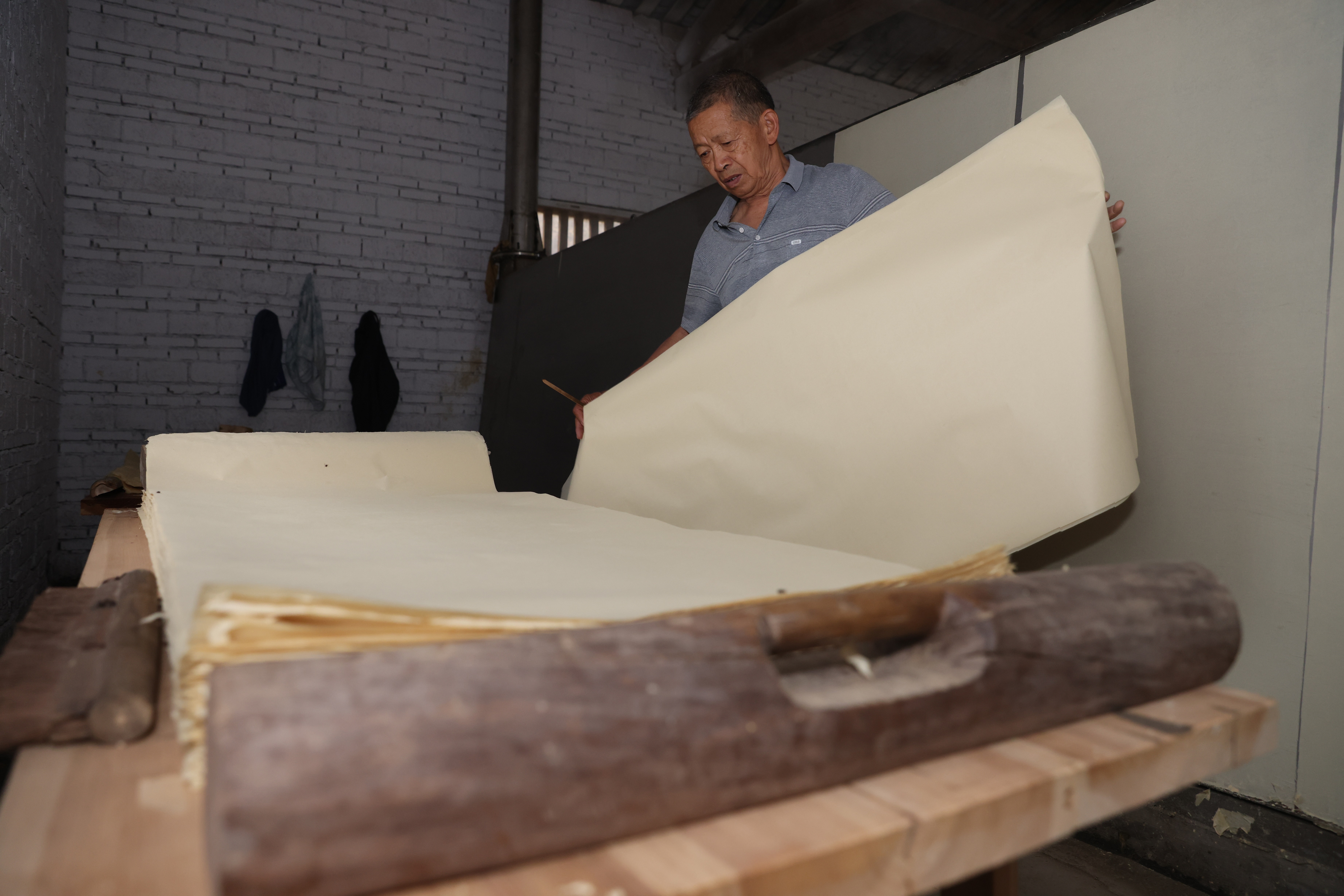 工人将焙好的纸叠放在一起。黄尉峰摄
