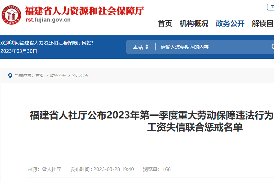 福建省人社厅公布2023年第一季度重大劳动保障违法行为和第一批拖欠农民工工资失信联合惩戒名单