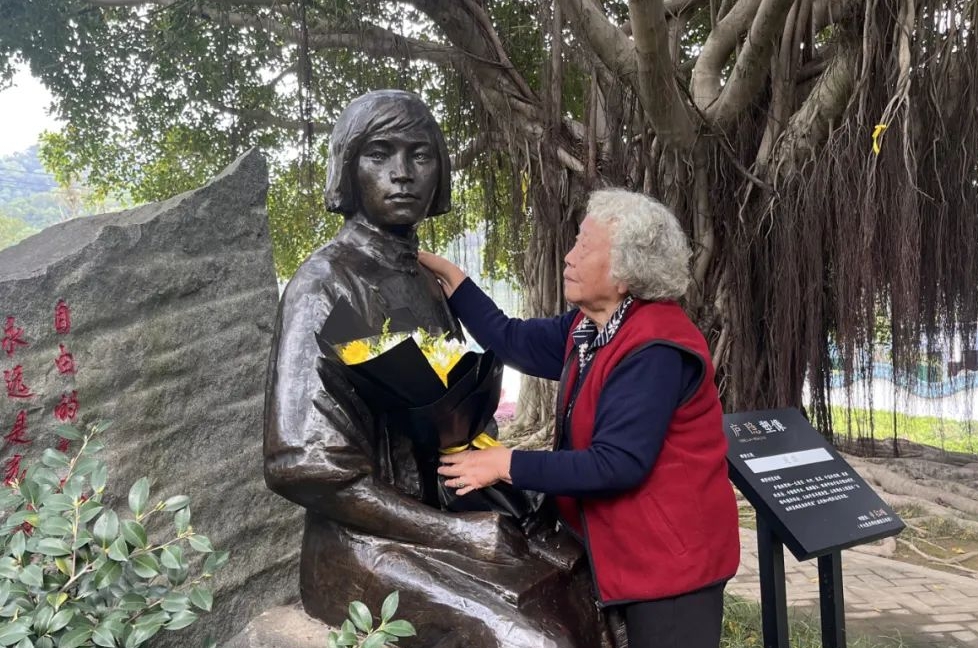 李恕先抚摸着母亲的铜像,献上鲜花。