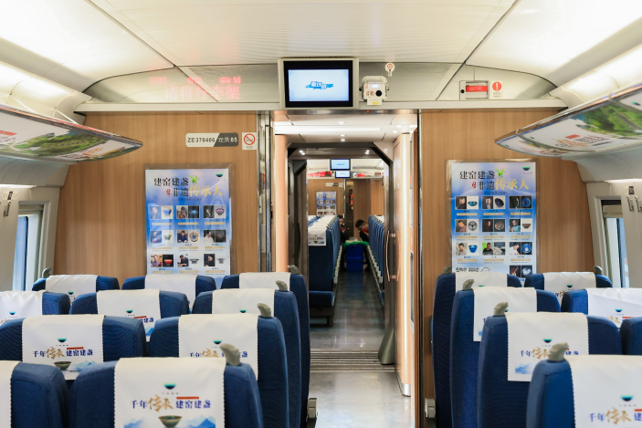 这辆G130次高铁列车,车厢内部充满建盏元素,座椅桌贴、枕巾、天幕、海报等,都印有“千年传承·建窑建盏”标语。“建窑建盏”将“搭乘”中国高铁列车,把这一非遗文化传播到更多地方,传递给更多人群。
