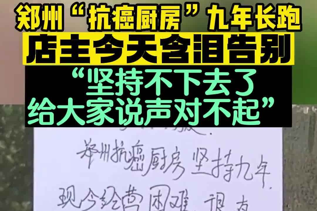 4月10日,因为经营困难,河南郑州“抗癌厨房”合伙人贴出告别信。信中写道:“广大的病属朋友:郑州抗癌厨房坚持九年,现今经营困难,很有可能坚持不下去了。给大家说声对不起,因为经营九年了非常不舍,谁会愿意舍弃呢?非常迫不得已。因为我们每天消耗巨大,已无以为继。”