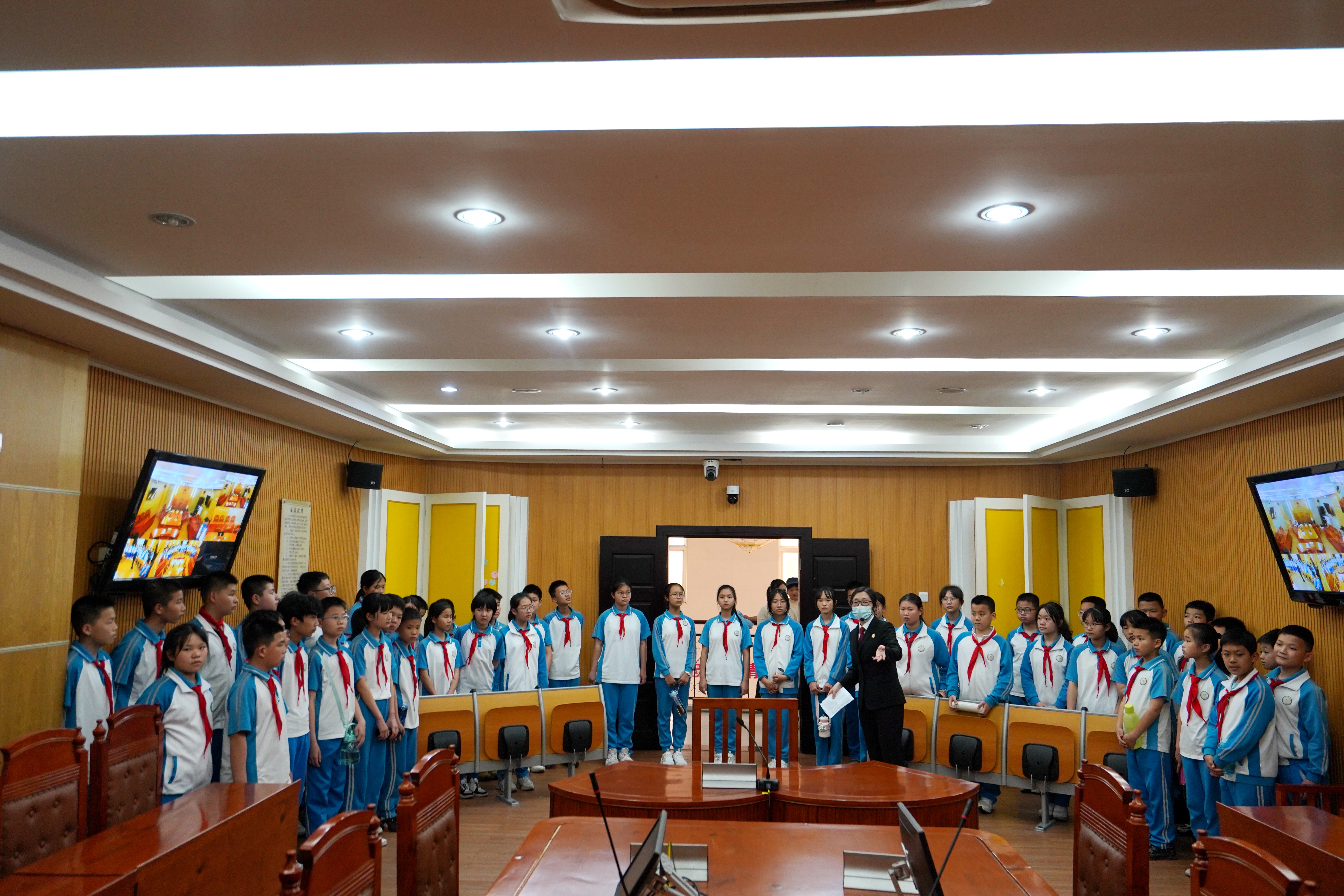 师生们还参观了龙文法院的少年法庭——“小苗法庭”,家事少年庭法官对“小苗法庭”的特点、功能以及庭审流程进行了介绍。最后,同学们穿法袍,拿起法槌,当起了小法官,模拟法庭庭审,现场气氛认真活跃。