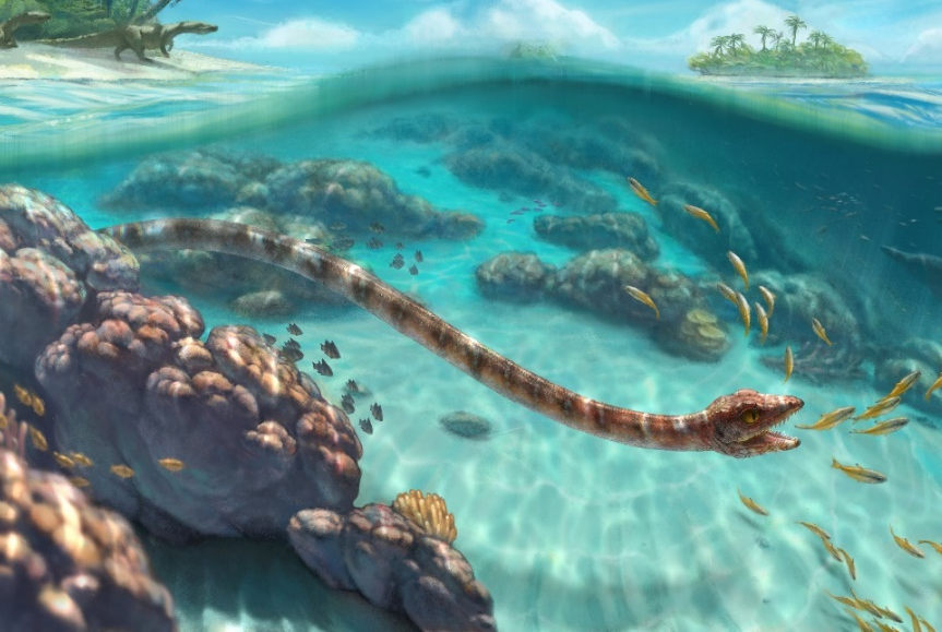 长颈龙(Tanystropheus)最初发现于三叠纪的欧洲,集中分布在如今的瑞士和意大利,地处古特提斯洋的西岸。近年来在中国西南地区,即特提斯东岸的三叠系中,研究人员也发现了长颈龙的化石,其中不乏一些保存精美的完整骨架。长颈龙属的大型物种体长接近6米,颈部约3米,从脖子与躯干的比例来看,它具有脊椎动物中“最长的脖子”。如此长的脖子,却只含有13枚颈椎,可见长颈龙是通过单节颈椎增长的方式来发展出长脖子,这在爬行动物中极其罕见。