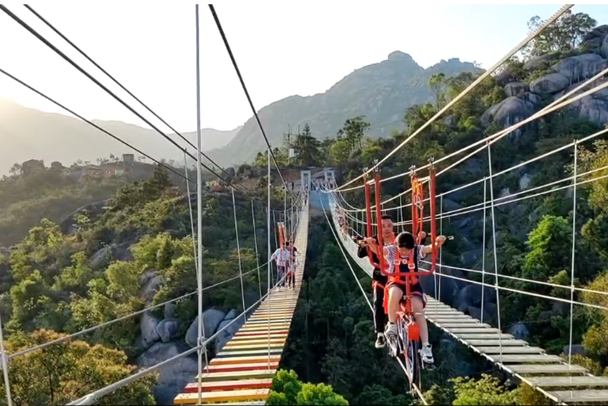 这座高空玻璃吊桥的桥面采用一块块透明的钢化玻璃沿着桥索一路铺设。站在桥上,仿佛飘在空中,下面是茂密的山林。吊桥全长约150米,整体离地约30米到50米,可以同时站立150人。