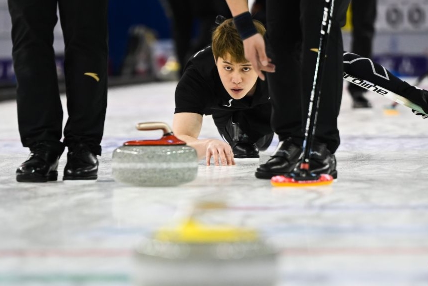 ↑福建队教练兼队员臧嘉亮在比赛中掷壶。