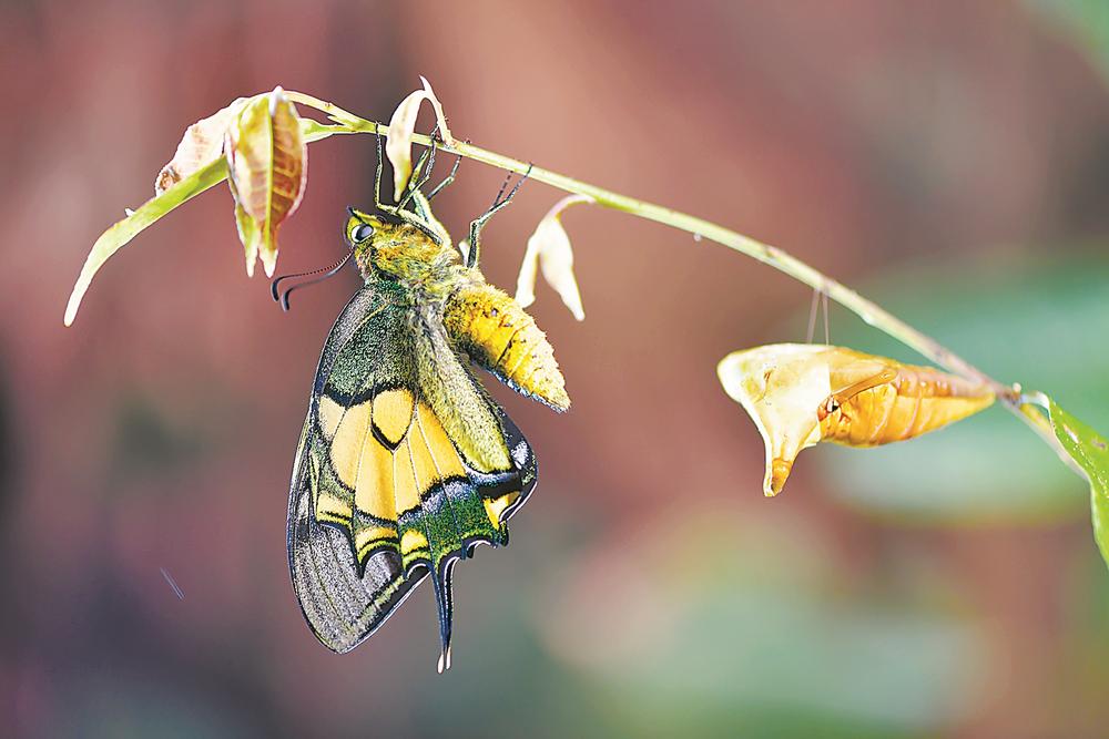 金斑喙凤蝶卵孵化出的幼虫叫作1龄幼虫,长到一定程度就会蜕皮,第一次蜕皮后的幼虫为2龄幼虫,以此类推,直到终龄幼虫蜕皮后进入蛹的阶段,最终破蛹羽化成蝶。经过持续观测,保护区科研监测人员记录下了金斑喙凤蝶从卵到1龄、2龄、3龄、4龄、5龄幼虫,直至当年11月化蛹的全过程。今年3月,经漫长蛰伏后,金斑喙凤蝶蛹壳逐渐转为黄色。3月底的一天晚上9时多,第一只金斑喙凤蝶破蛹而出,直到第二天清晨才振翅飞走。