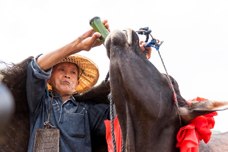 村民身着蓑衣,给耕牛喂食糍粑增福。