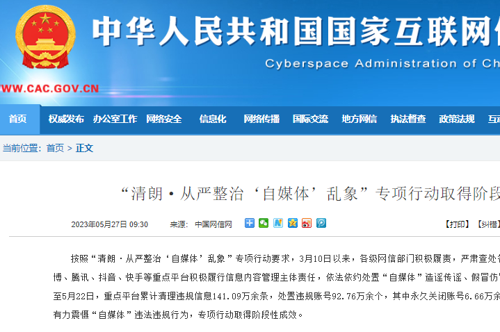 按照“清朗·从严整治‘自媒体’乱象”专项行动要求,3月10日以来,各级网信部门积极履责,严肃查处各类违规“自媒体”账号。微博、腾讯、抖音、快手等重点平台积极履行信息内容管理主体责任,依法依约处置“自媒体”造谣传谣、假冒仿冒、违规营利等突出问题。截至5月22日,重点平台累计清理违规信息141.09万余条,处置违规账号92.76万余个,其中永久关闭账号6.66万余个,对外发布公告110余期,有力震慑“自媒体”违法违规行为,专项行动取得阶段性成效。
