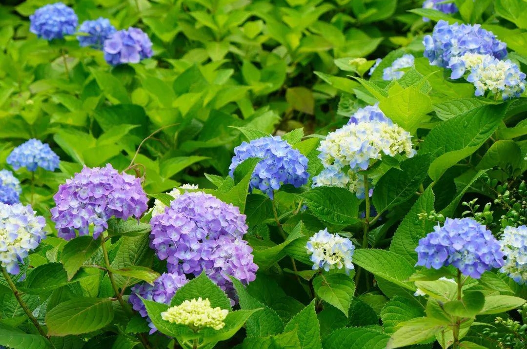 一簇接着一簇的绣球花色彩斑斓,洒落生长在度假区的各个区域,形成不同风格的绣球花海景观。