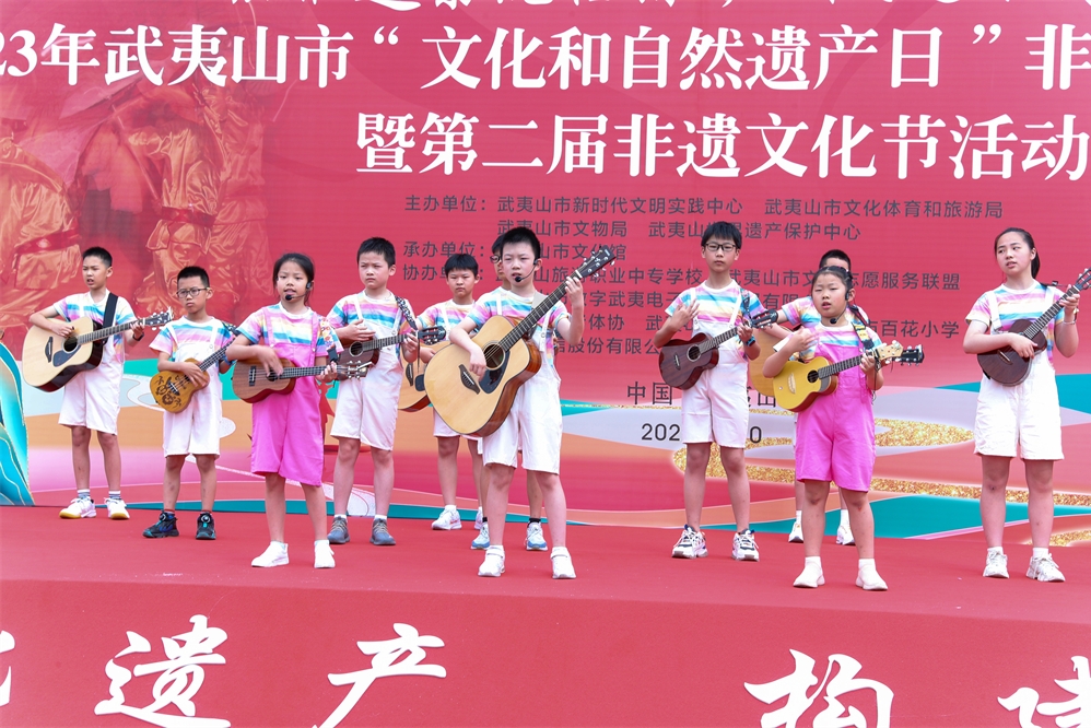 6月10日,福建武夷山市青少年在“云游武夷 乐享非遗”展示“文化遗产”活动中表演乐器演奏。