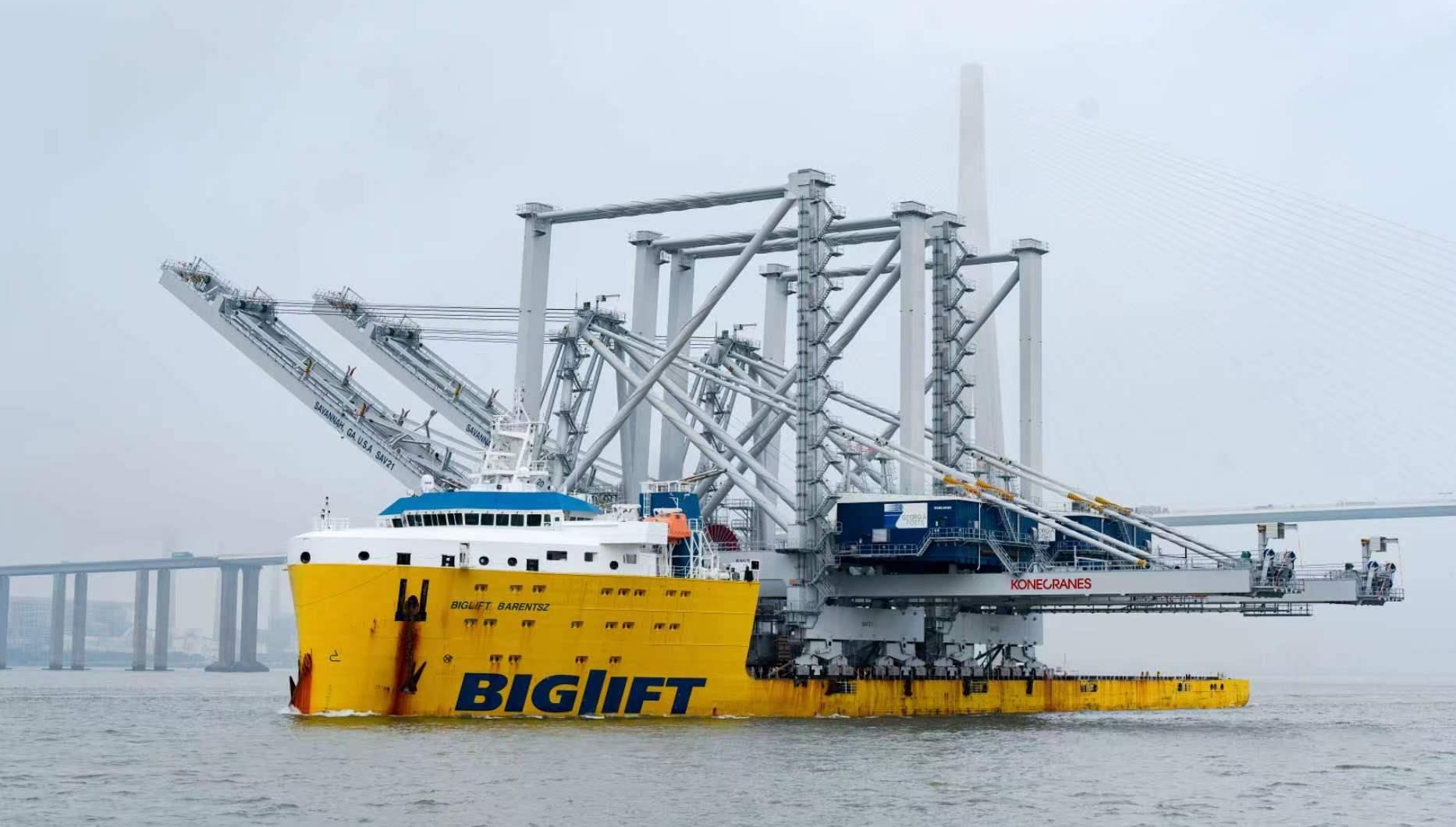 今天(6月13日)早晨5时30分许,装载2台大型集装箱桥吊的荷兰籍大件运输船“巴伦支海”轮解下最后一根缆绳,缓缓驶离码头。