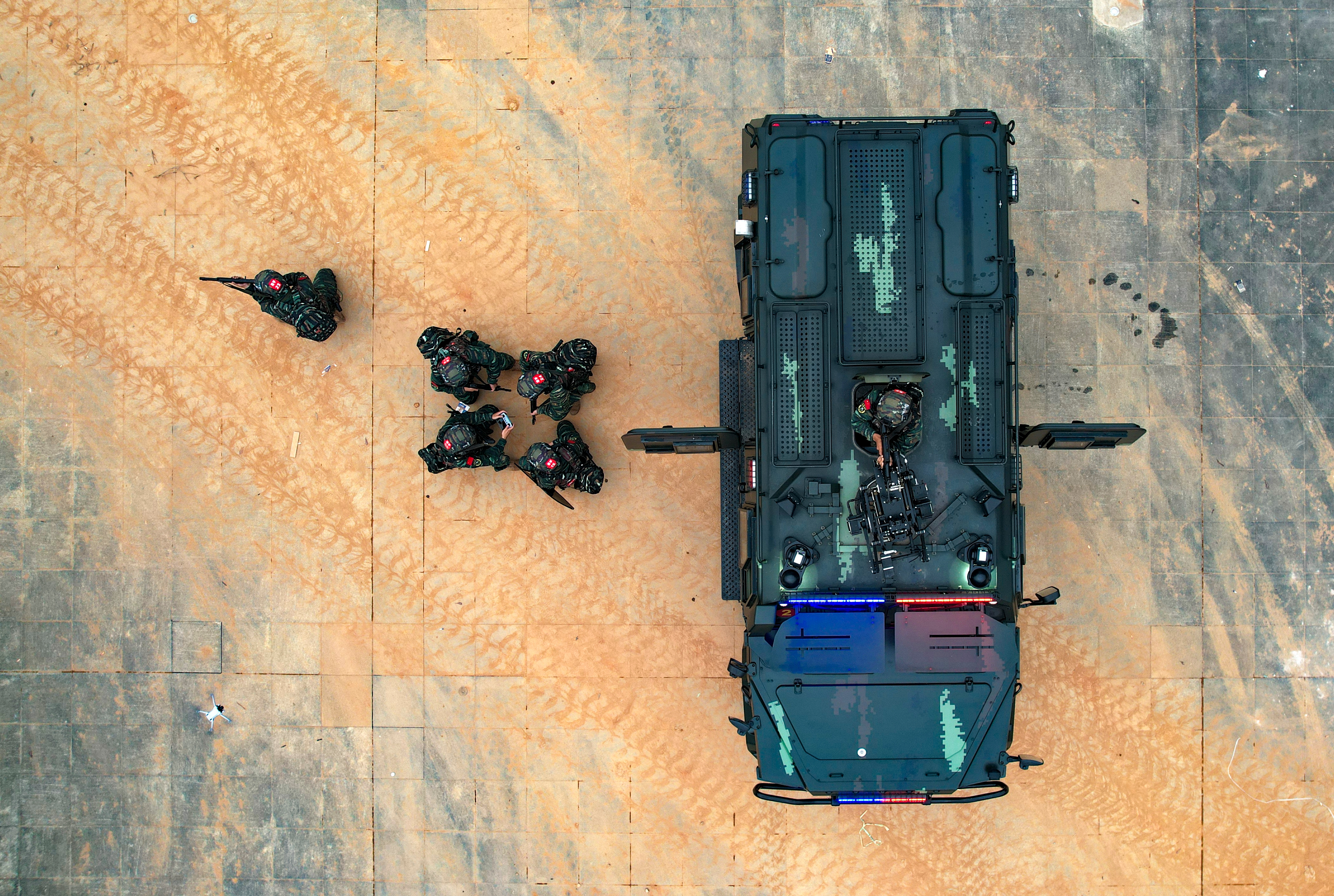 按预案抵达目标区域后,指挥员迅速部署任务、明确分工。无人机升空,侦察组前出判明情况……特战队员密切协同,悄然接近“暴恐分子”隐匿处。侦察组利用各种侦察设备对“暴恐分子”所在区域和楼内情况进行实时监视,突击组占领有利地形并实施多维立体封控,狙击组抢占有利位置监视目标区域。