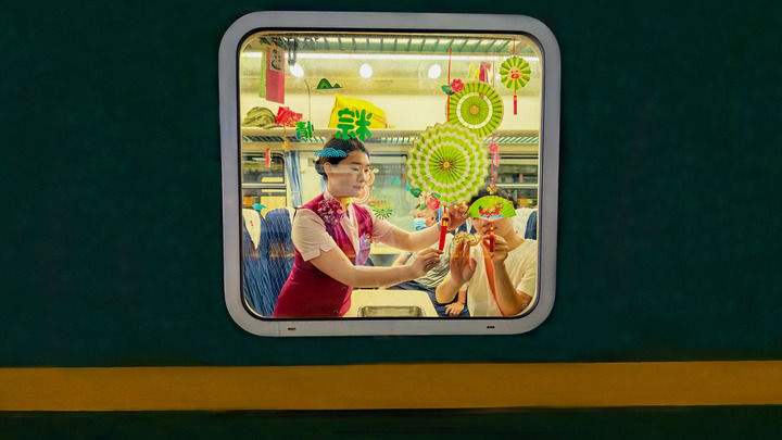 6月21日,在K8746次列车上,旅客和列车乘务员用贴片装饰车窗。