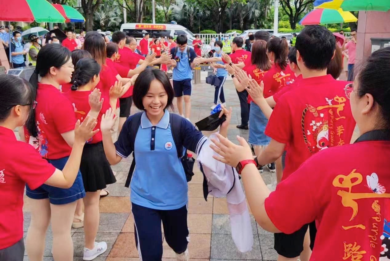 在厦门市第十一中学考点外,考生们陆续进入校门。在“越过山丘 顶峰相见”的标语下,老师们纷纷身着红衣,与同学们击掌鼓励。前来送考的家长们也在门外守候,目光跟随着孩子的背影,带着期许记录下这一刻。