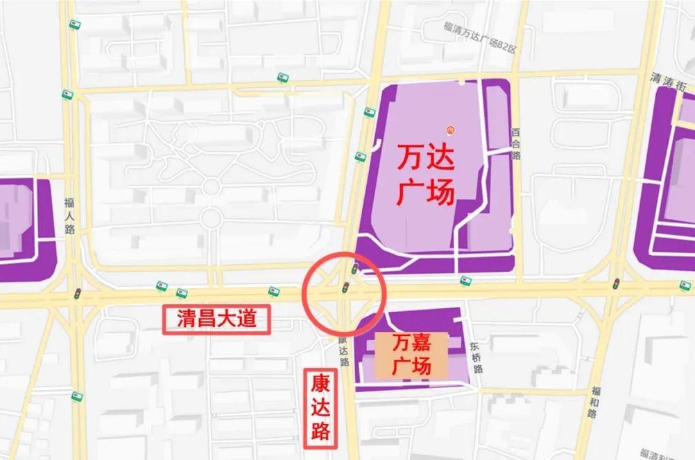 清昌大道康达路属于城市主干道清昌大道的一个十字路口,位于城市中央位置,路口东北侧有万达广场、东南侧有万嘉广场,位于商业圈,路口车流量、人流量大。