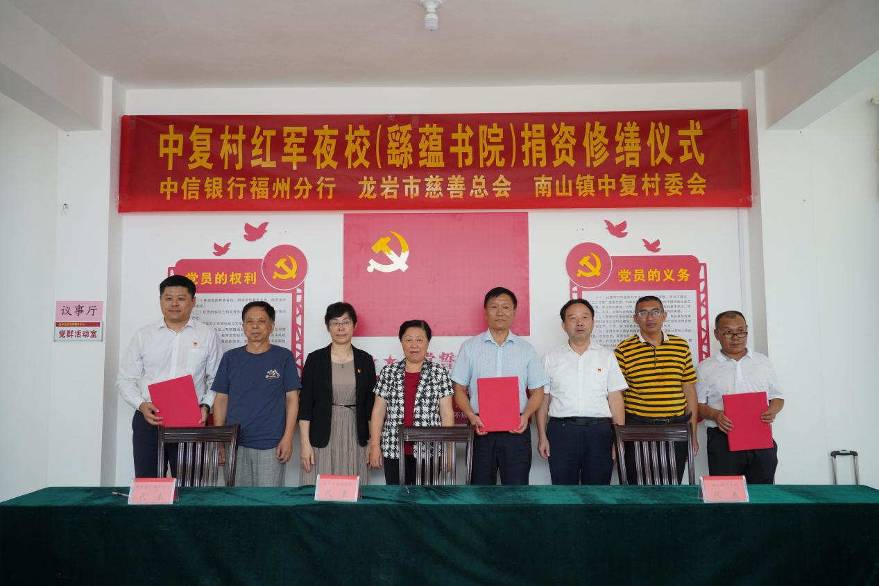 7月1日,正值中国共产党102周年诞辰,中信银行福州分行向“红军长征第一村”——长汀县中复村捐款73万余元,用于中复村红军夜校(繇蕴书院)书院修缮,传承弘扬红军长征精神和苏区精神,助推革命老区建设。分行纪委书记李华舒、相关部门、经营机构负责人及员工代表参加活动。龙岩市慈善总会会长杨闽出席捐赠仪式。