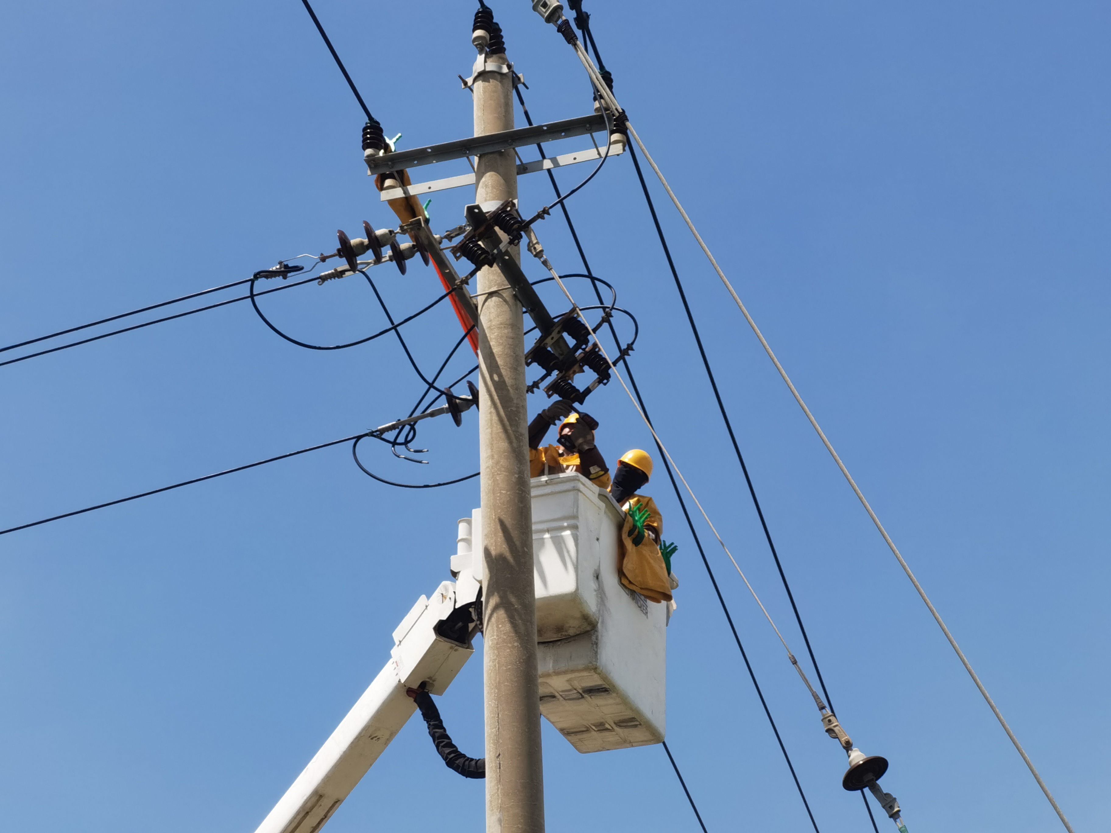 夏日炎炎,骄阳似火。7月4日,在10千伏洪溪I路#046杆上,国网福清市供电公司配网不停电作业一班“全副武装”随绝缘斗臂车缓缓上升到半空中,头顶烈日,娴熟地进行验电、装设遮蔽罩、扎绝缘夹等一系列操作。