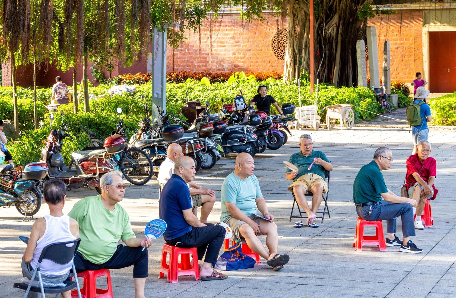 夏日雨后,在泉州府文庙榕树下,人们坐在椅子上享受着夏日清凉。(陈栋良 摄)