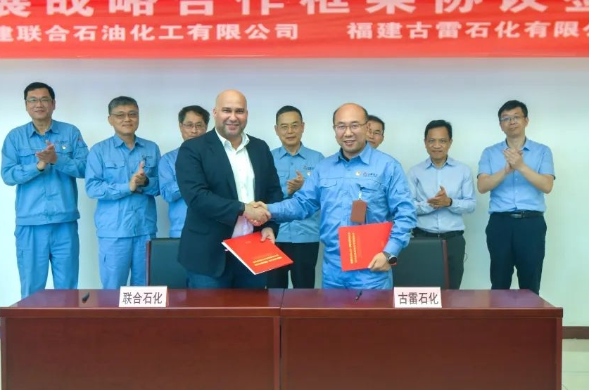 福建日报·新福建客户端7月7日讯 (通讯员 卢林 苏 哲 邱丽平/文 苏哲/图 )7月6日,福建古雷石化公司和福建联合石化公司签订《协同发展战略合作框架协议》。双方从长远发展战略出发,经友好协商,本着优势互补、平等互利、合作共赢的原则,建立战略合作关系,通过协作提升市场竞争力,在互惠互利基础上发挥各自优势共同发展,获得良好的社会效益和投资回报。