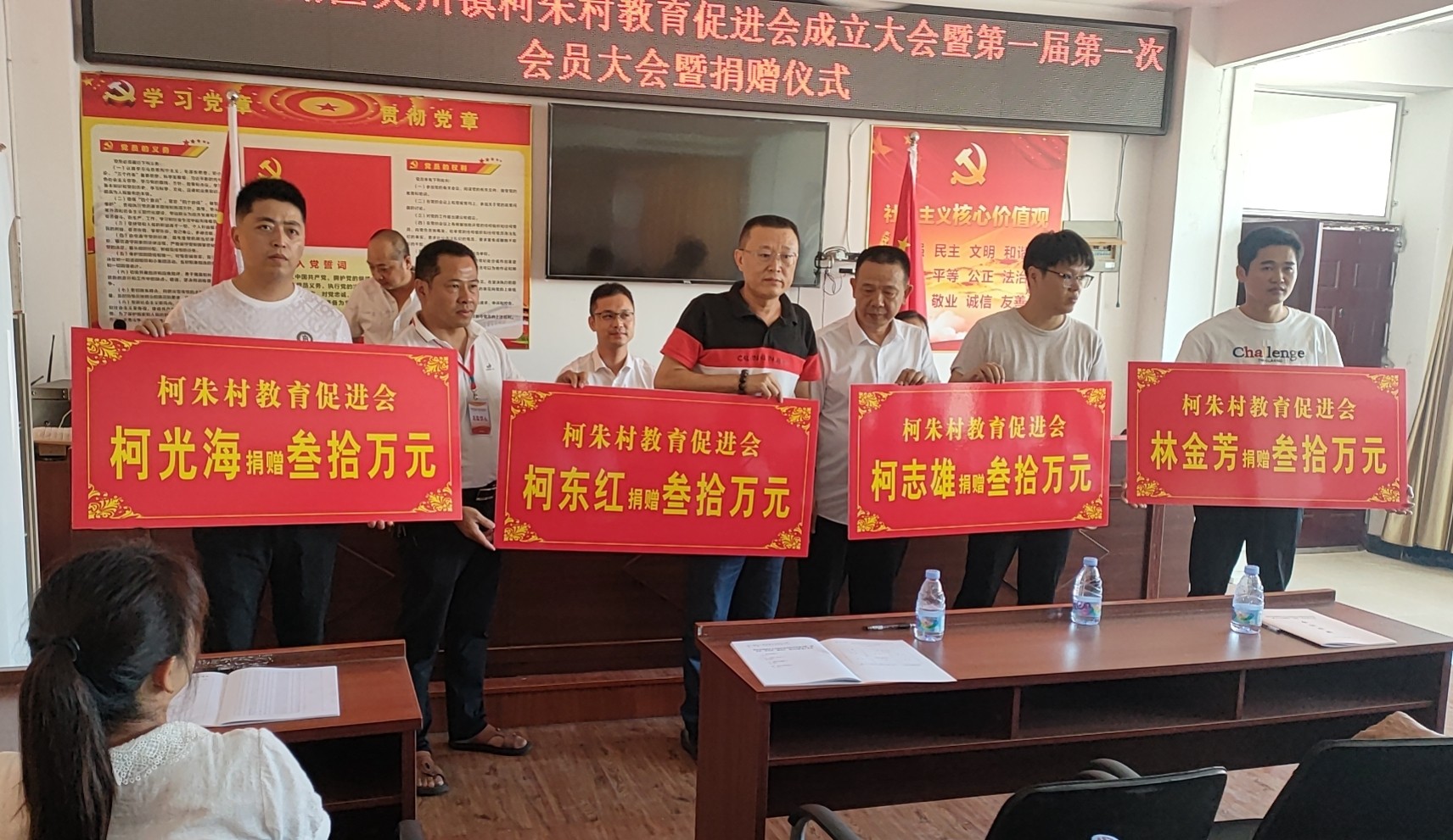 促进会成立大会上,选举产生了柯朱村教育促进会第一届会长、监事长、副会长、秘书长、理事和监事,并为捐款30万元的捐赠者举行授牌仪式。