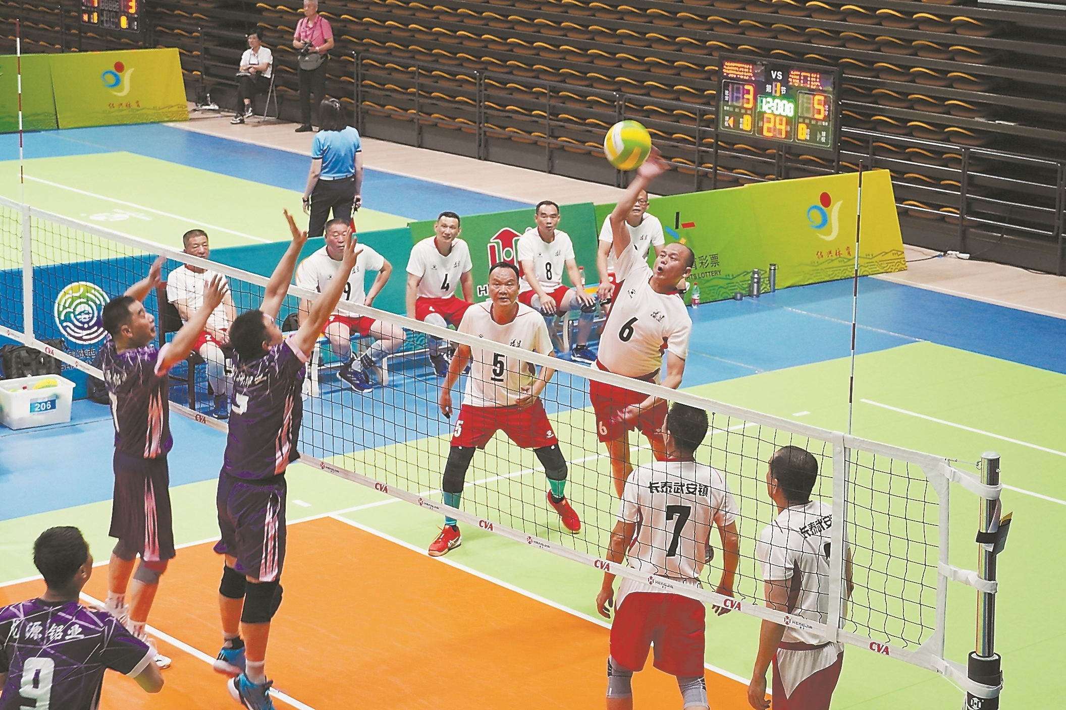 夜幕来临,长泰文体中心体育馆传来欢呼声和球鞋与地板的摩擦声,运动员们高跳扣杀、拦网冲吊、攻防转换,不断刷新战术水平。