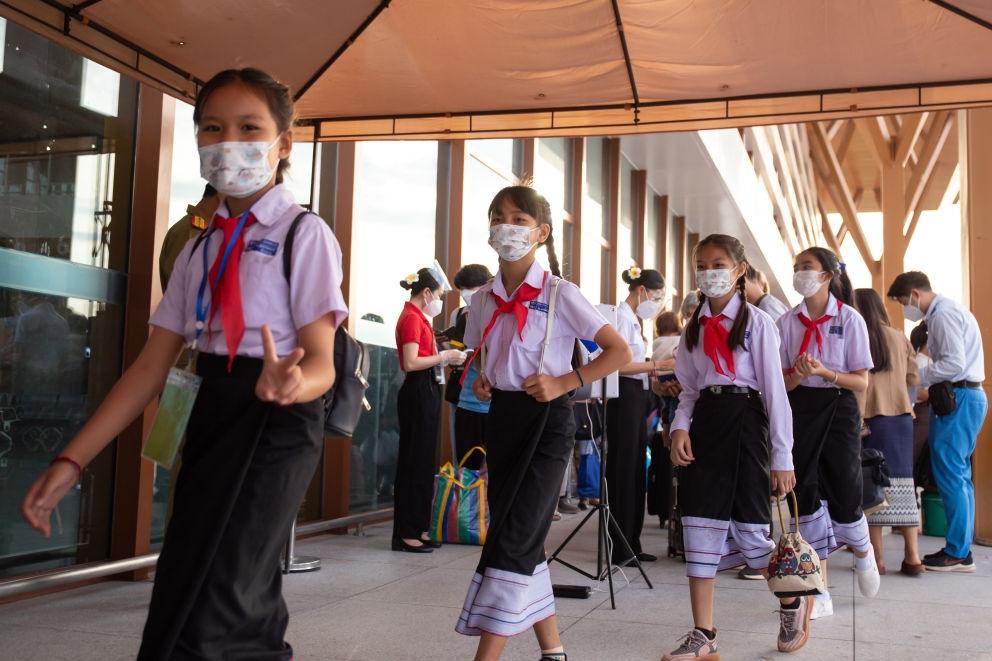 2022年12月1日,在老挝首都万象火车站,中老友好农冰村小学的学生进站。