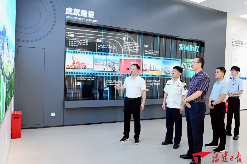 调研组一行来到开发区规划展示馆,详细了解古雷石化基地发展历程、产业布局、港口规划等情况,并前往石化园区漳州海事局VTS工程(古雷头雷达站),现场查看船舶交通服务系统(VTS)运行以及古雷港区码头建设等情况,对下一步工作提出具体要求。