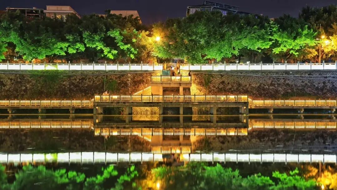 远处的鱼鳞坝也开启了夜间模式