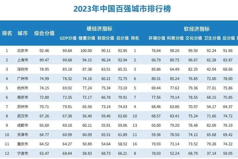 这是华顿经济研究院连续第九年编制发布中国百强城市榜单。华顿中国百强城市排行榜以GDP总量排名前110位的地级及以上城市作为年度入围城市,按照其硬经济指标和软经济指标综合得分进行排序,取前100位作为年度上榜百强城市。硬经济指标由GDP、储蓄和财政组成,软经济指标由环境、科教、文化和卫生组成。各单项指标分值由其总量分值和人均量分值综合而成。