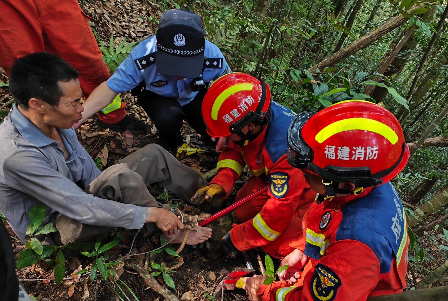 7月20日上午,德化县盖德镇鬼腔口往北4公里处两名男子为采摘红菇走进崎岖的山林,不料其中一人被捕兽夹“咬”住。8时25分,德化县龙浔消防救援站接到报警后立即派员赶赴现场进行救援。