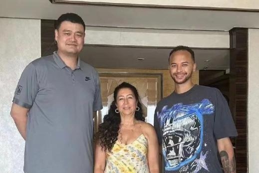图片为中国篮协主席姚明、李凯尔及其母亲合影。图片来源:中国篮协