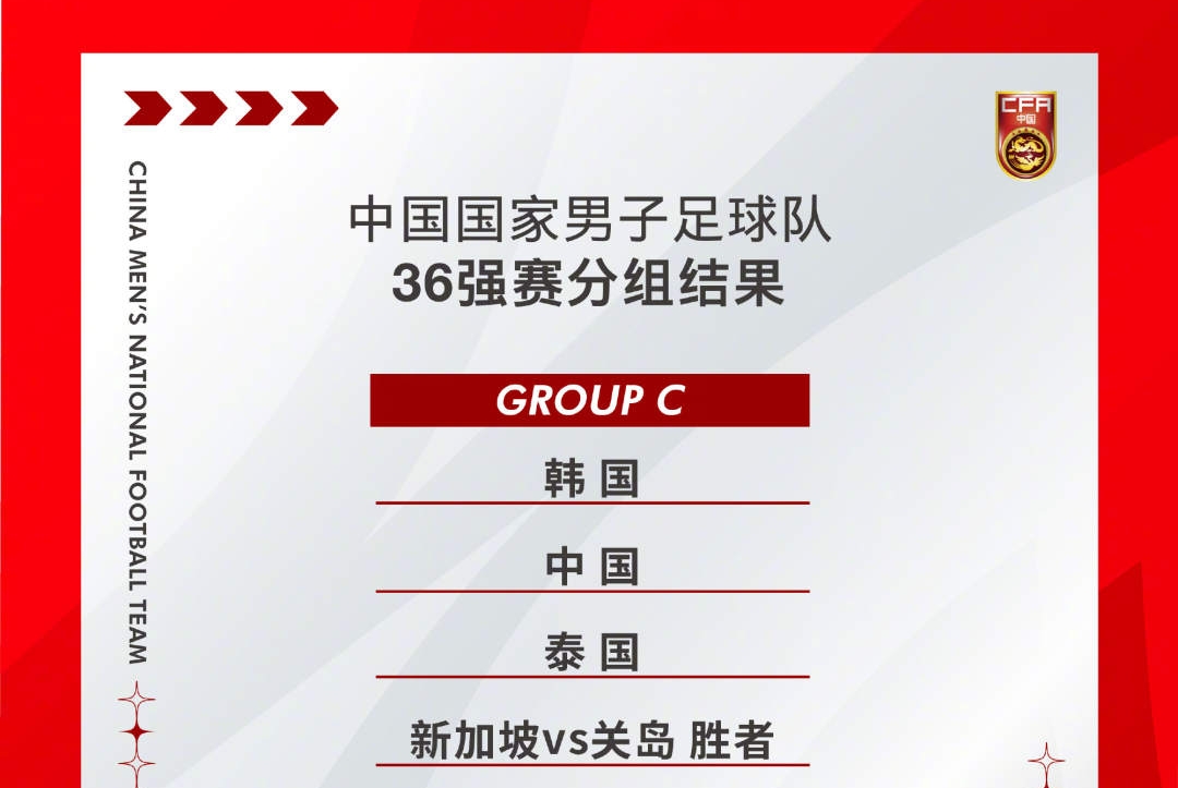 在刚刚结束的2026美加墨世界杯预选赛亚洲区36强阶段比赛抽签仪式上,中国队被分入C组,同组对手为韩国队、泰国队以及新加坡队与关岛队的胜者。参赛的36支球队将被分为9组,各小组前两名,共18支球队将晋级下一阶段的预选赛,同时获得2027亚洲杯决赛阶段比赛的资格。